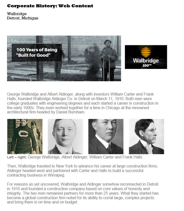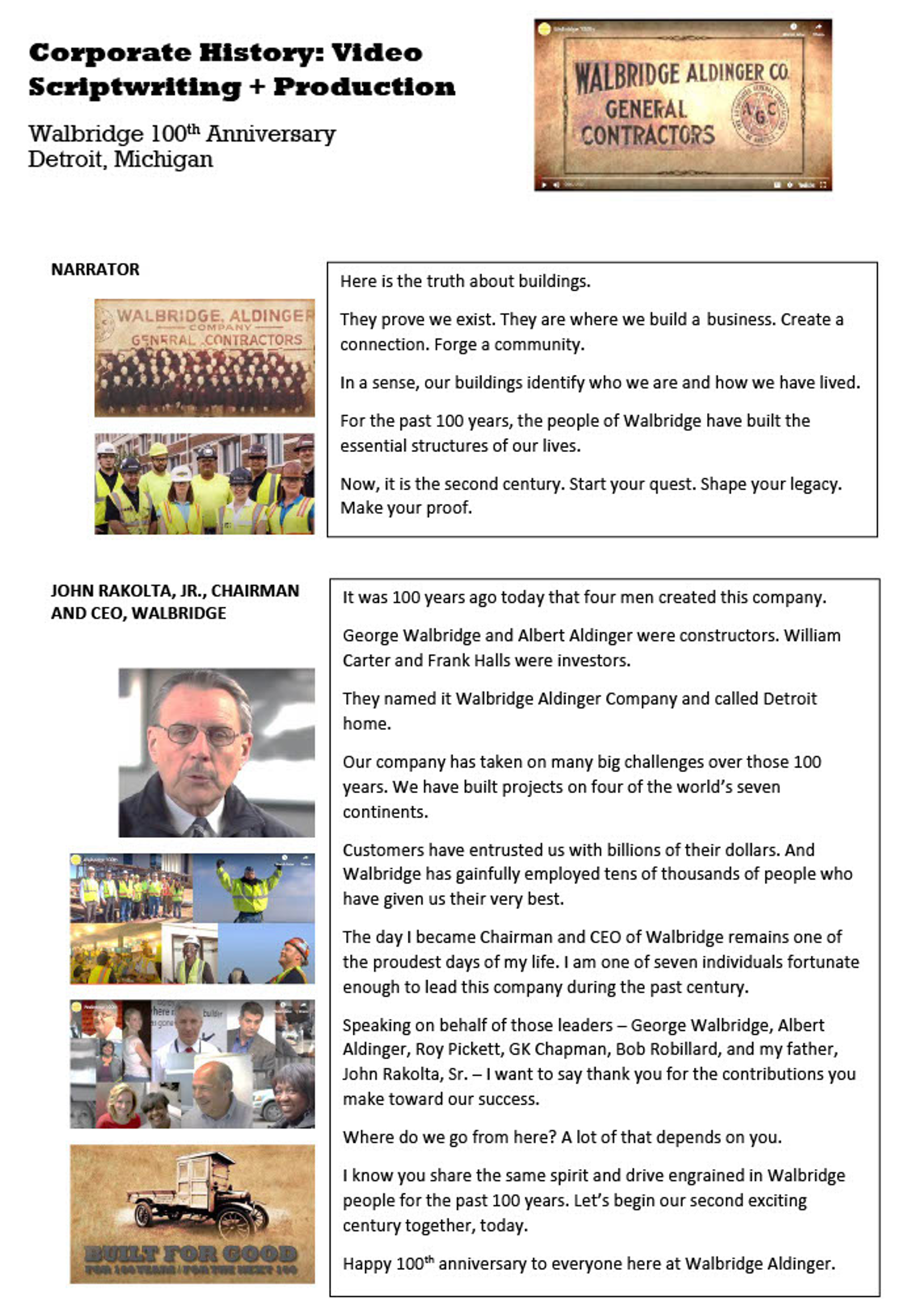 Video script for construction company Walbridge was created by Mark Marymee, chief prospector at HistoryMinerz.com